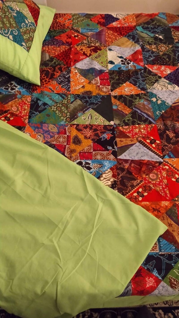 Deze unieke dekbedovertrek is volledig samengesteld uit patchwork van verschillende stoffen en patronen, wat zorgt voor een rijk, warm en levendig geheel.
